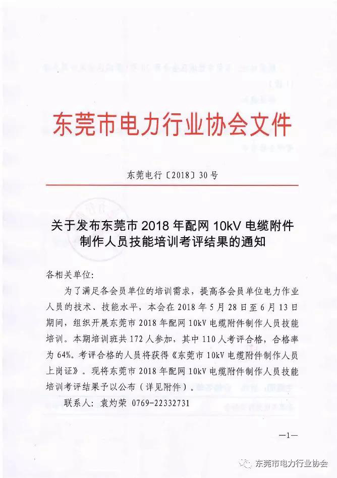 为了提高我司电力作业人员的技术、技能水平,我司指派陶工、杨工参加东莞市电力行业协会组织的东莞市2018年配网10kV电缆附件制作人员技能培训。